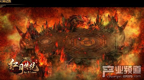 火神试炼的场地,是一方被红莲业火包围的高台。整个高台由陨铁铸成,伴有青龙等石像在四周。倘若还是个新人,怕是还未接近,就会被场地散发的灼热之气所烫伤。当然,这种身心的磨砺并不是面向所有人。为保护新手,游戏设定只有65级以上的玩家才可以参加火神的试炼。虽每天都可以来此地挑战,但开放的时间只在下午15点到15点20分,仅出现20分钟便会关闭。传奇之地从来不会等人,记得若是有意,且去寻主城的NPC卢大樱,她可以直接将你传送到这个特殊的场景。