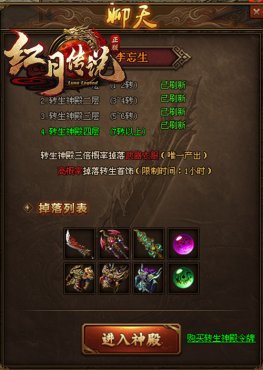 转生神殿共有4层,转生神殿一层(1-2转),转身神殿二层(3-4转),转身神殿三层(5-6转),转身神殿四层(7转以上),在51《红月传说》转生神殿内藏有许多不为人知的宝藏,最高可以获取7转武器衣服,还有8转的饰品呢。大家击杀神殿内的魔王即可有机会获得宝物。