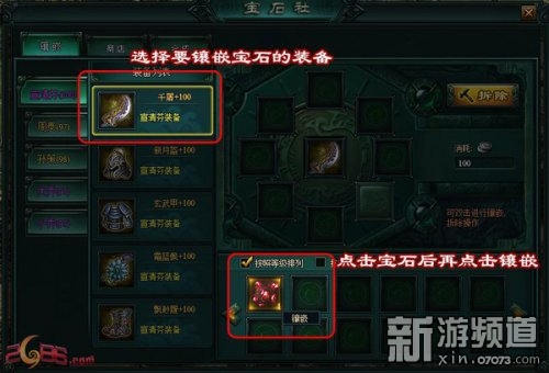 玩家选择要镶嵌宝石的装备后,双击宝石或者点击宝石弹出“镶嵌”按键再点击镶嵌即可。