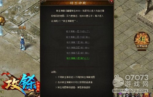 低级的BOSS每2小时刷新一只,高级的4小时,最高级的6小时会刷新出一只,反正进入转生神殿不要钱,有空没空都可以去逛一逛,若是见BOSS刷新时间将近,可以直接在里面挂机等待,然后抢先占领杀BOSS的机会!