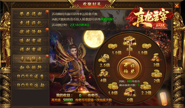 活动期间充值可获得幸运转盘次数,消耗转盘次数和传奇币投入转盘可获得高额回报!