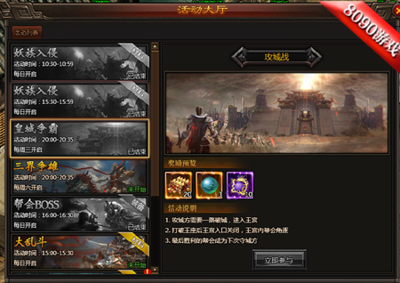 皇城争霸活动时间是每周三的晚上,20:00-20:35。只有35分钟,超过时间活动结束,你就失去获得奖励的大好机会咯。所以一定要准时参加哦。