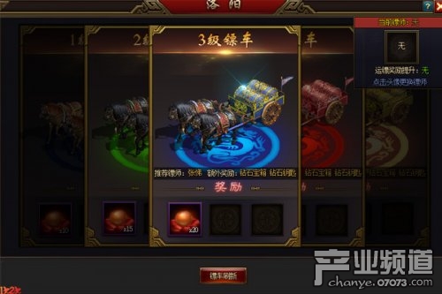 之后选择镖车,镖车分为5个等级,镖车等级由系统随机生成,等级越高,奖励越多。点击“刷新”可领取镖车,若是对刷到的镖车满意,可点击“派遣”按钮开始押镖,但如果不想要当前的镖车,那就可以放弃镖车,重新选择。放弃镖车需消耗绑元,随着放弃次数增加,价格也会逐渐上升。
