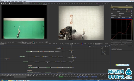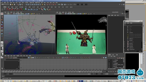 同时后期制作部门开始紧张的制作阶段,中国水墨风为整个节目的基调,这对三维角色以及场景设定和打斗特效都增加了一定的难度。由于时间紧迫,节目1月初就要录演,公司经常通宵熬夜加班,一个个睁着一对红红的兔眼盯着显示器。从模型到材质,角色的骨骼绑定,动作的调试,期间又经过很多次的反复修改。12月10日,第一次进棚拍摄,这次拍摄非常重要,后期需要将这次在绿色背景下面拍摄的画面进行抠像对位,演员和虚拟的三维角色动作结合,两位演员带妆表演。整个拍摄用了将近一天的时间,拍摄素材马上拿回公司进入后期制作。一直到12月底,期间又进棚拍摄了两次,“一个好的作品是不断修改出来的”,这句话是我们经常说的一句话,不过在经过几次调整之后节目整个效果也越来越好。在历经了一个半月,前期后期一共30多位人员的共同努力下,终于一个时长8分50秒的成片新鲜出炉!
