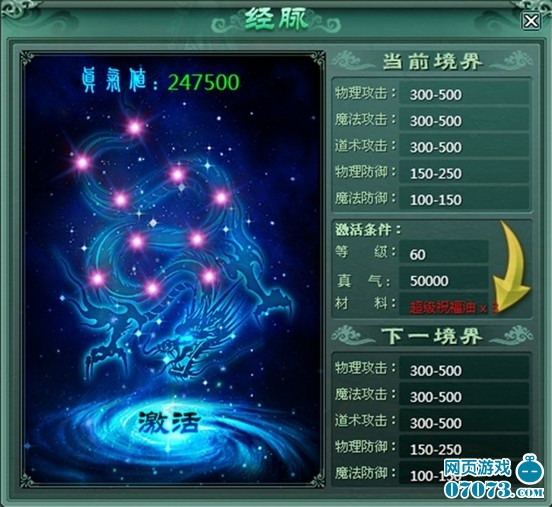 经脉,乃为人行气血之根本,怒斩内的经脉系统,关系着角色本身的资质,除了经脉本身所加的大量属性点之外,某些稀有首饰经脉达不到的话,也不能穿戴,是游戏中非常重要的一个系统。换句话说,如果你不好好突破一下经脉,只顾着打怪升级的话,所造成的结局很有可能是:满包的顶级装备,已经没有办法穿戴,这是多么悲摧啊。