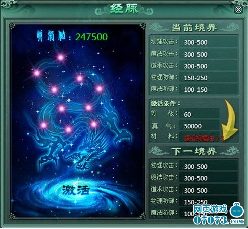 不过不是随随便便就能提升经脉层次的,毕竟不是一进少林寺,就能学习易筋经的。9377《怒斩》经脉提升有等级限制,必须要达到等级,并且获得足够的真气值,以及相应的材料。在满足上面三大条件后,才可点击激活对当阶经脉进行升级。