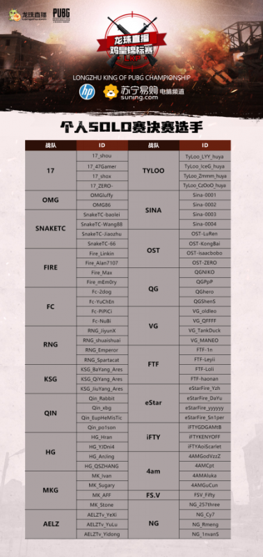 除了4AM和17之外,其他各支战队也是精英尽出,SnakeTC的堡垒、QG的NIKO、iFTY的烤人、郭德纲、FC的YuChEn,在此前的比赛中均是击杀排行榜上的常客,他们能否在SOLO赛中同样带来亮眼的表现?还请期待今晚好戏上演!
