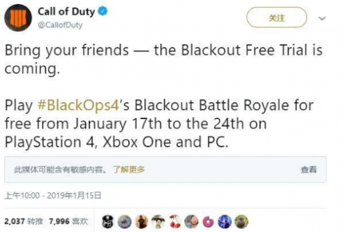 此外,游戏还时不时给玩家们一些浮力,比如近日官方表示使命召唤黑色行动4的“大逃杀”Blackout模式进行为期一周的限时免费活动,PS4/Xbox One/PC平台玩家都可以免费游玩,时间从1月17日到1月24日。