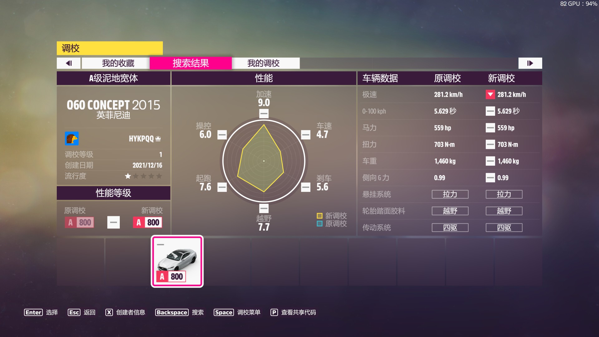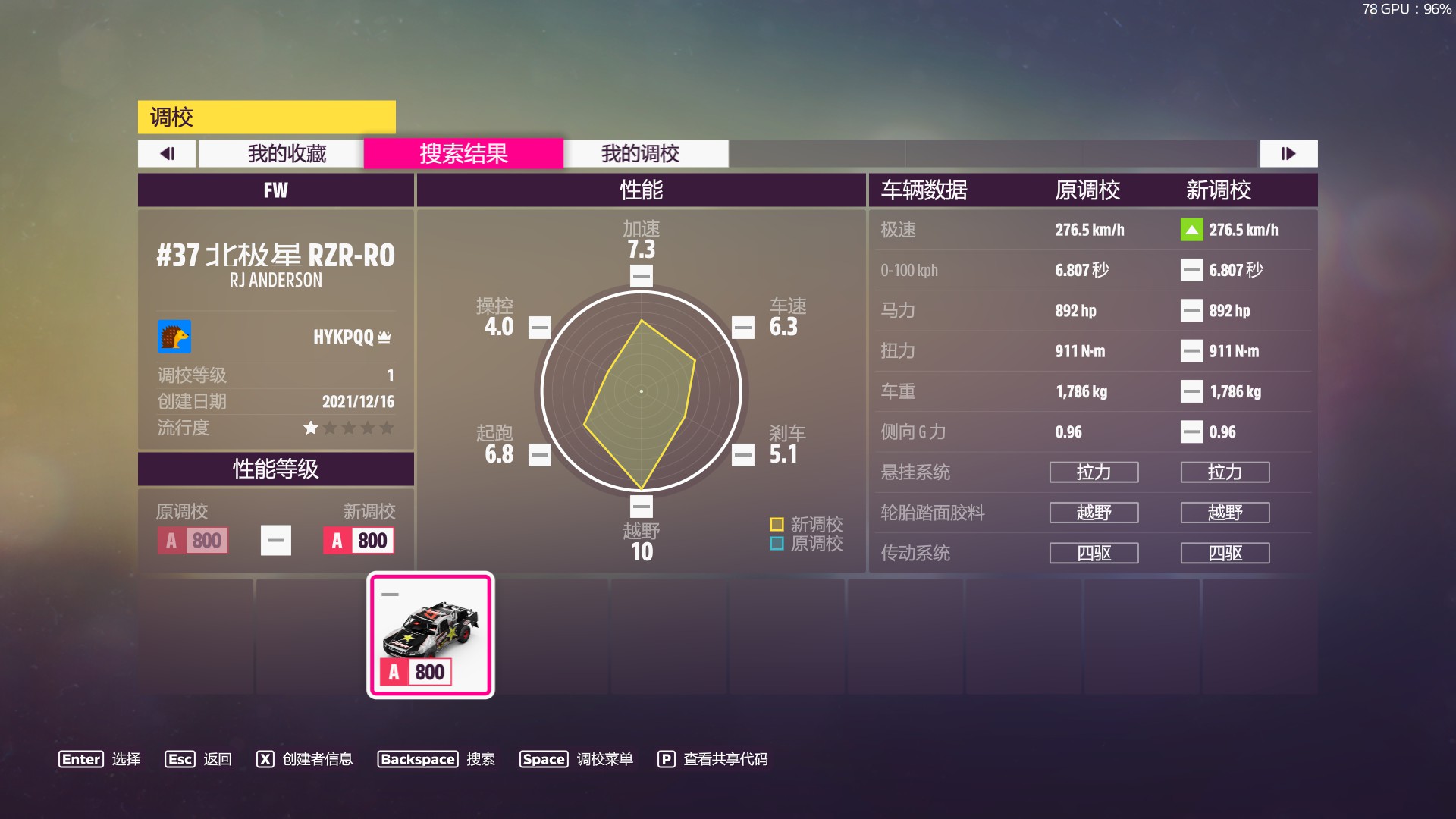 蛇头:A800 泥地,超级轿车,其他车我不一定能调多好,A800泥地我肯定没问题,因为A800泥地可能是FH5调校最公式化的组别了。四驱+强力引擎(如6.2V8+离心增压),无脑越野胎,后胎宽拉满,尽量减重拉满,还有空间就升一下引擎,实在手感差就小改一下悬挂,稍微凑一下分,选件就差不多了。然后胎压双1.3左右,随手拉齿比,防倾杆前后大概平均5/55,根据手感小调,中差65左右,减速前10以下,后10~16,加速前面比后面低一点,调到嗯拐临界转向过度状态就行,这一套下来就是一辆手感挺不错的A级拉力车了,大伙有兴趣可以自己试一下。